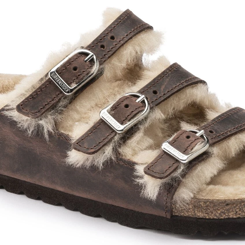 The Florida Fresh – strappy style meets signature comfort. This BIRKENSTOCK slide features three slender, adjustable straps and a contoured cork/latex footbed that forms to the shape of your foot. This version is lined with especially cozy shearling. With D-buckles and a color-coordinated footbed to round off the overall look. The upper is made from extra thick, oiled nubuck leather.