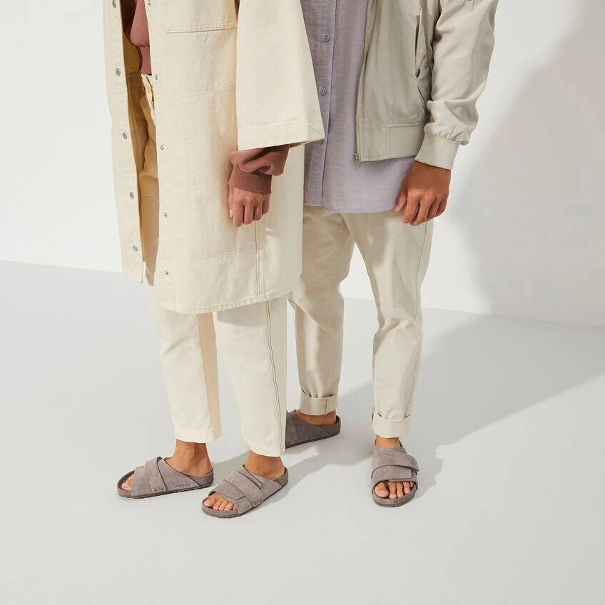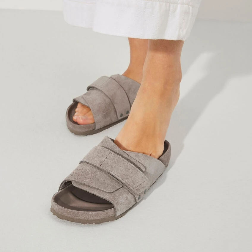 The casual BIRKENSTOCK Kyoto stands out with its envelope design and individually adjustable hook and loop closure. Giving this casually stylish sandal a slipper like fit and feel. This exquisite version features a footbed fully lined with luxuriously smooth, color coordinating leather. The upper is made from especially soft suede.